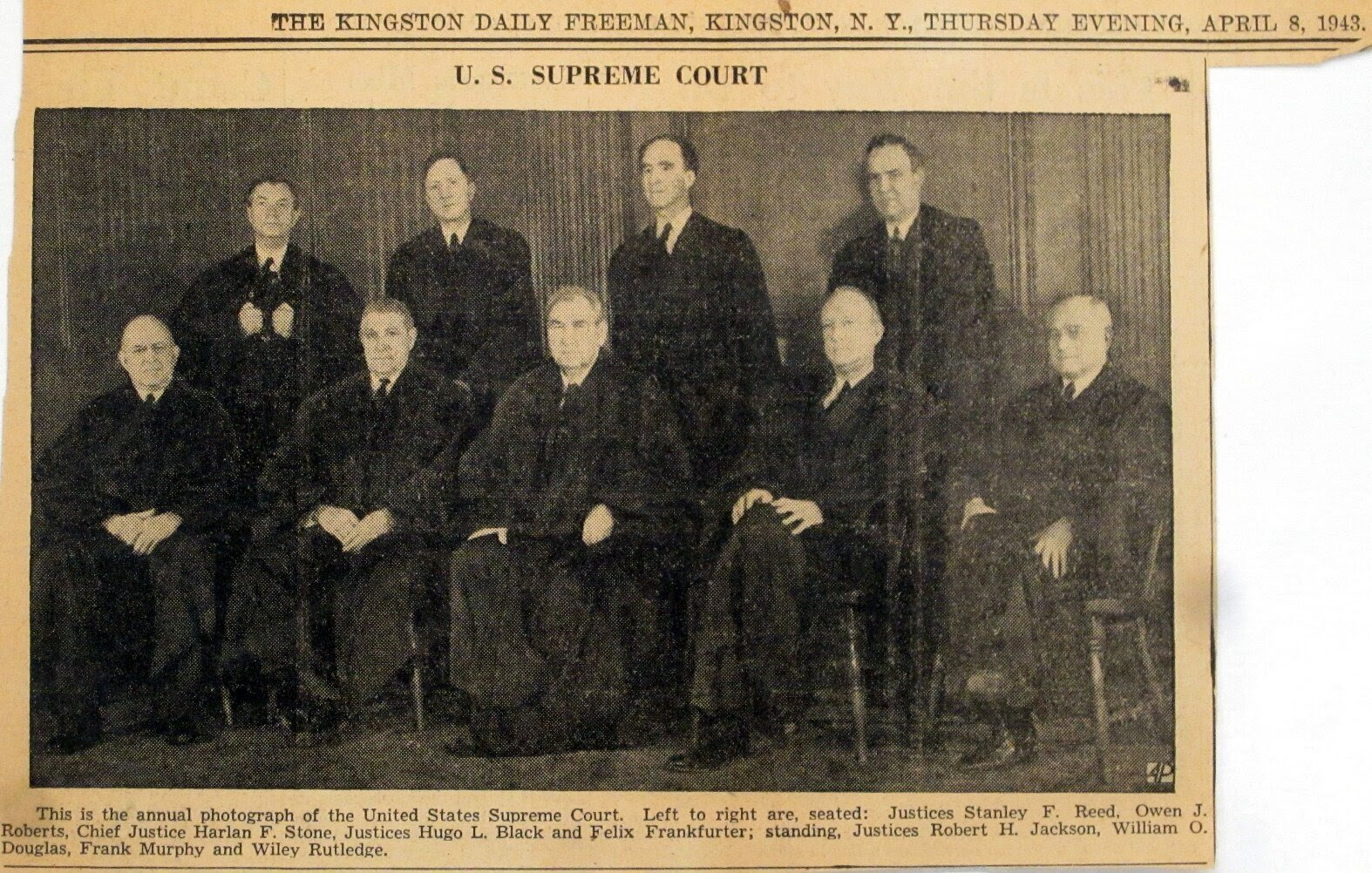 Mrs. Roosevelt came to the Court on Wednesday, March 17, 1943. She had a relaxed luncheon with seven justices: Chief Justice Harlan Fiske Stone and Associate Justices Owen J. Roberts, Hugo L. Black, Stanley Reed, Frankfurter, Robert H. Jackson, and Wiley Rutledge. (Associate Justices William O. Douglas and Frank Murphy were absent.)