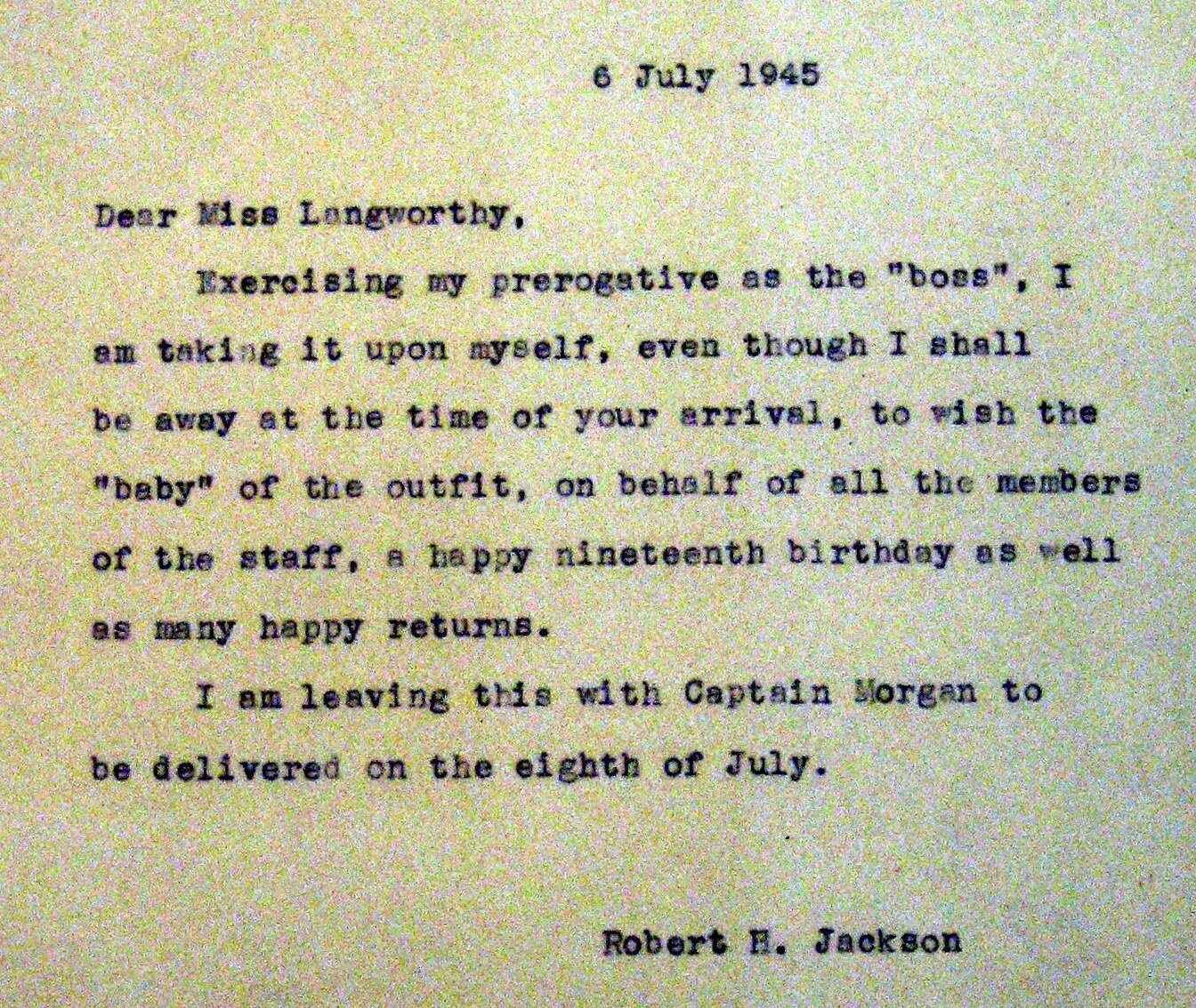 So on Friday, July 6, Jackson, before he embarked on his trip, dictated greetings to Langworthy, had them typed, signed the paper, and left it for staff to deliver to her on her birthday.