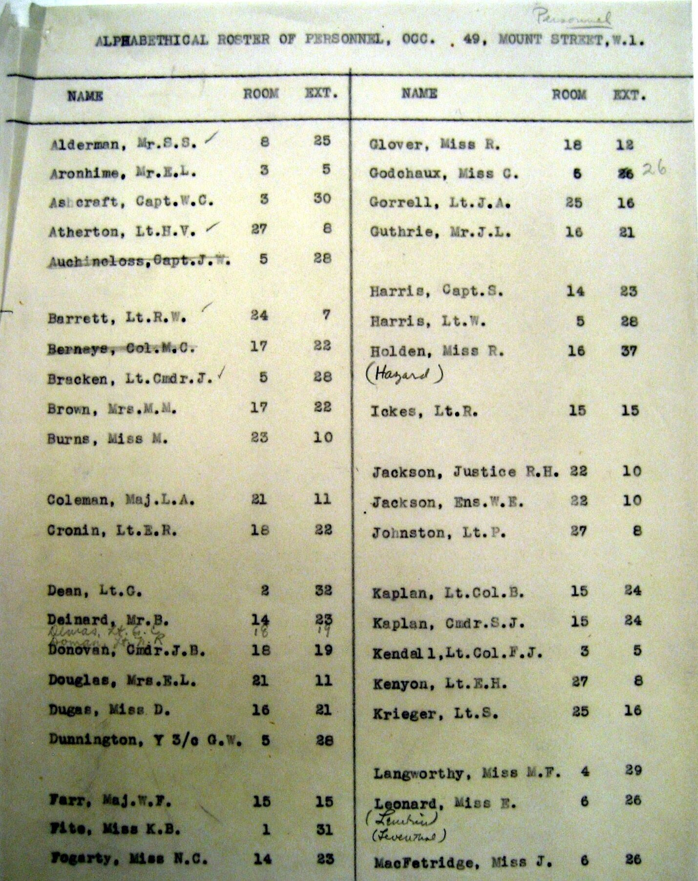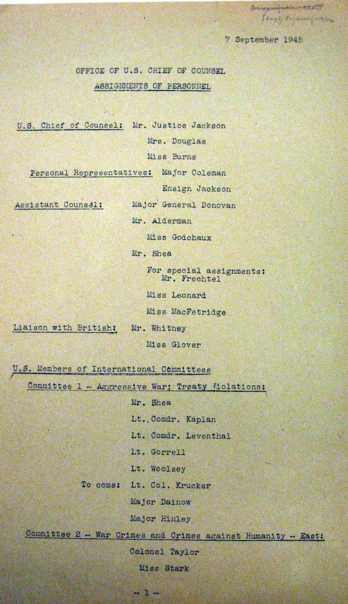 In Summer 1945, Miss Langworthy’s work became an international adventure. She was detailed to travel to London to join the Office of United States Chief of Counsel for Prosecution of Axis Criminality—the OCC, Justice Robert H. Jackson’s Nazi war crimes prosecution team. Jackson then was negotiating with Allied government counterparts to devise the plan to prosecute surviving Nazi leaders as international arch-criminals while also supervising the U.S. investigative staff in Washington, London, Paris, and elsewhere.
